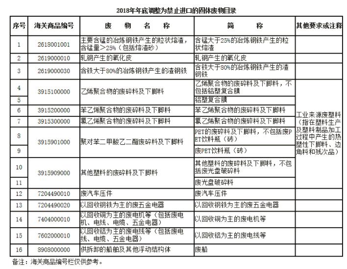 一、将废五金类、废船、废汽车压件、冶炼渣、工业来源废塑料等16个品种固体废物(见附件1),从《限制进口类可用作原料的固体废物目录》调入《禁止进口固体废物目录》,自2018年12月31日起执行。