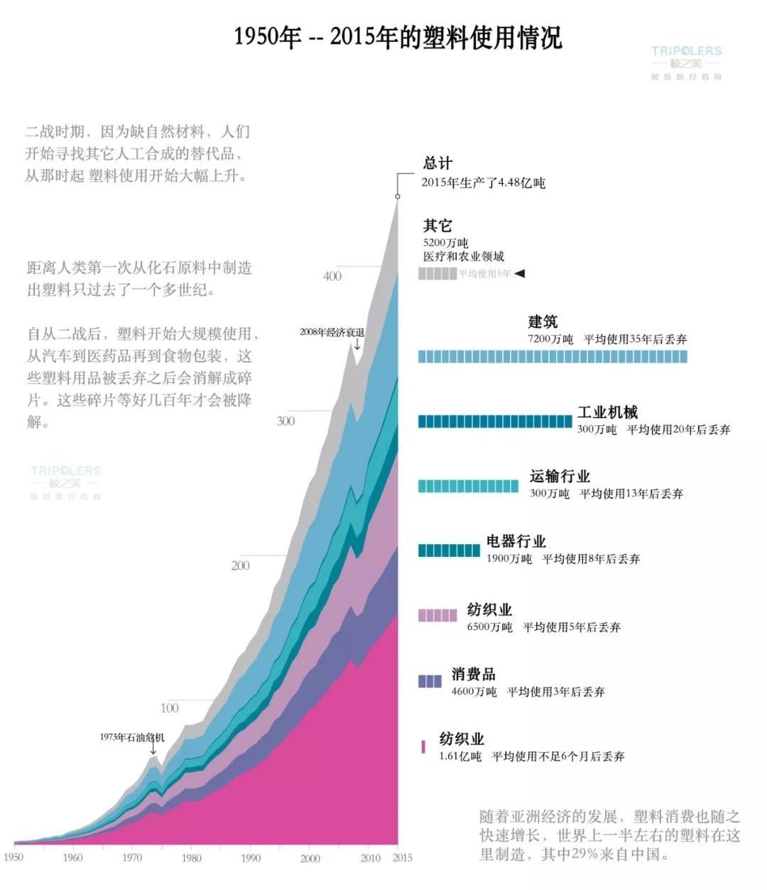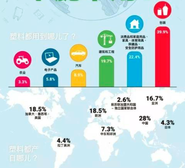 自1869年,美国人J.W.海厄特发现了赛璐珞(塑料的一种)并在三年后投入量产以来,塑料的运用已经有140多年的历史了。塑料因为质地轻、不会锈蚀、耐冲击、加工成本低、绝缘性好等优点,被广泛的用于服装、烹饪、餐饮、产品设计、工程以及零售等行业,已经成为生活中不可或缺的一部分。短短半个世纪,全球塑料产量从每年200万吨激增至2016年的3.8亿吨,增速是全球GDP的3倍。