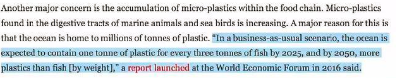 据《卫报》报道,全球消费者每秒就可售出约20000个塑料瓶,并且这个数字预计在三年内还将增长20%。联合国秘书长古特雷斯警告称,按照商业惯例,到2025年,预计世界海洋每三吨鱼中就会包含一吨塑料,到2050年,海洋中塑料垃圾的总重量可能会超过鱼类重量。美国科学杂志《科学进展》估计,截至2017年7月,人类已生产了至少83亿吨塑料,而全球得到回收的塑料只有9%左右,另有12%的垃圾经过了焚烧处理,其余的79%则被堆放在垃圾填埋场或暴露在自然环境中,当然这就包括了海洋和其他水道。